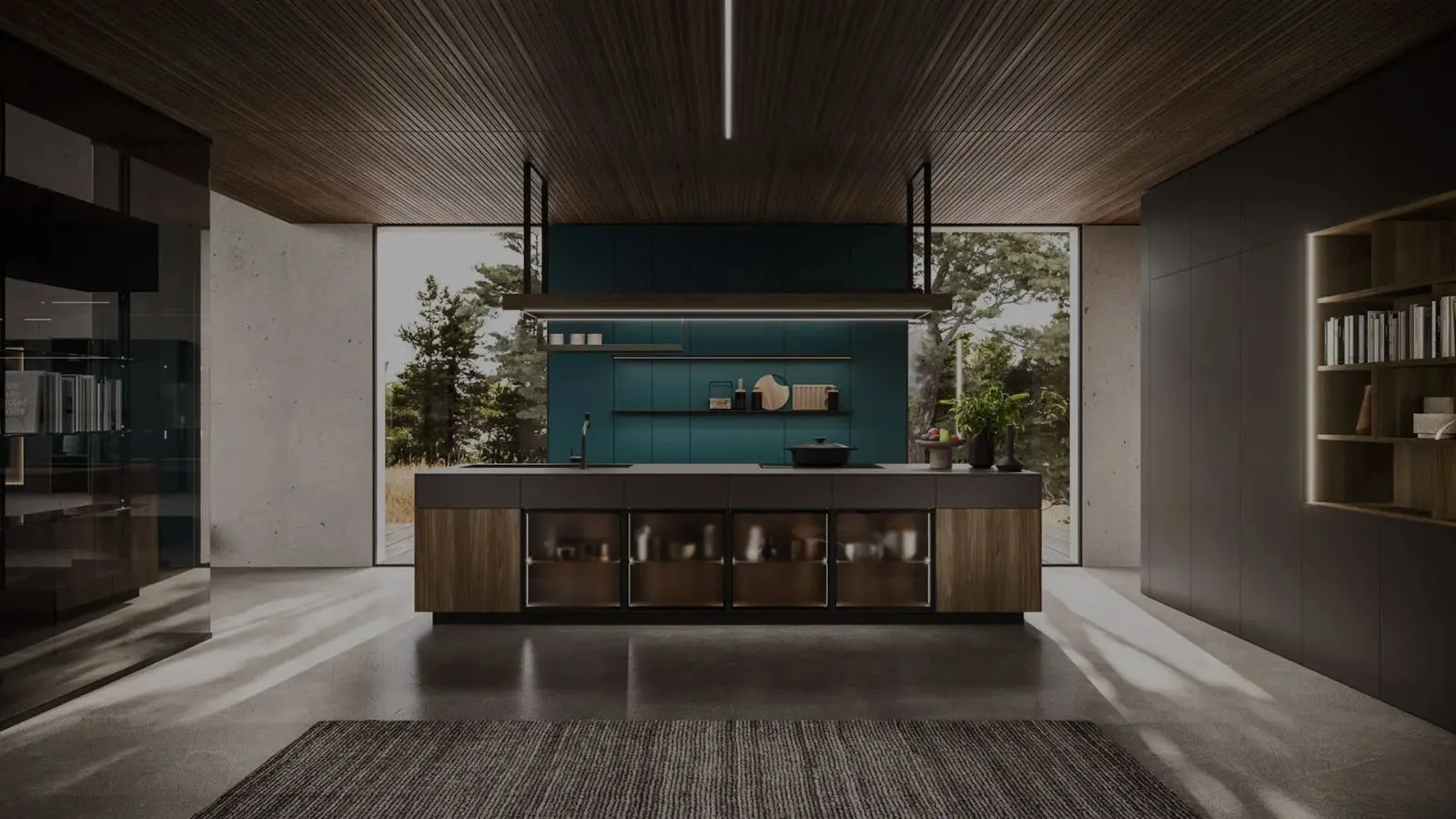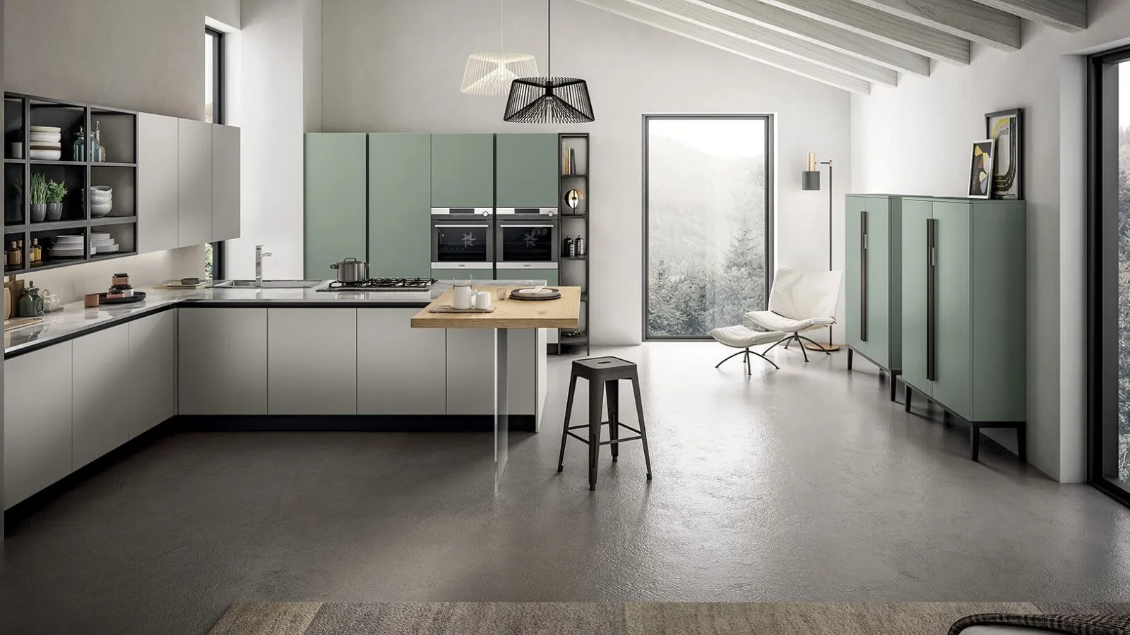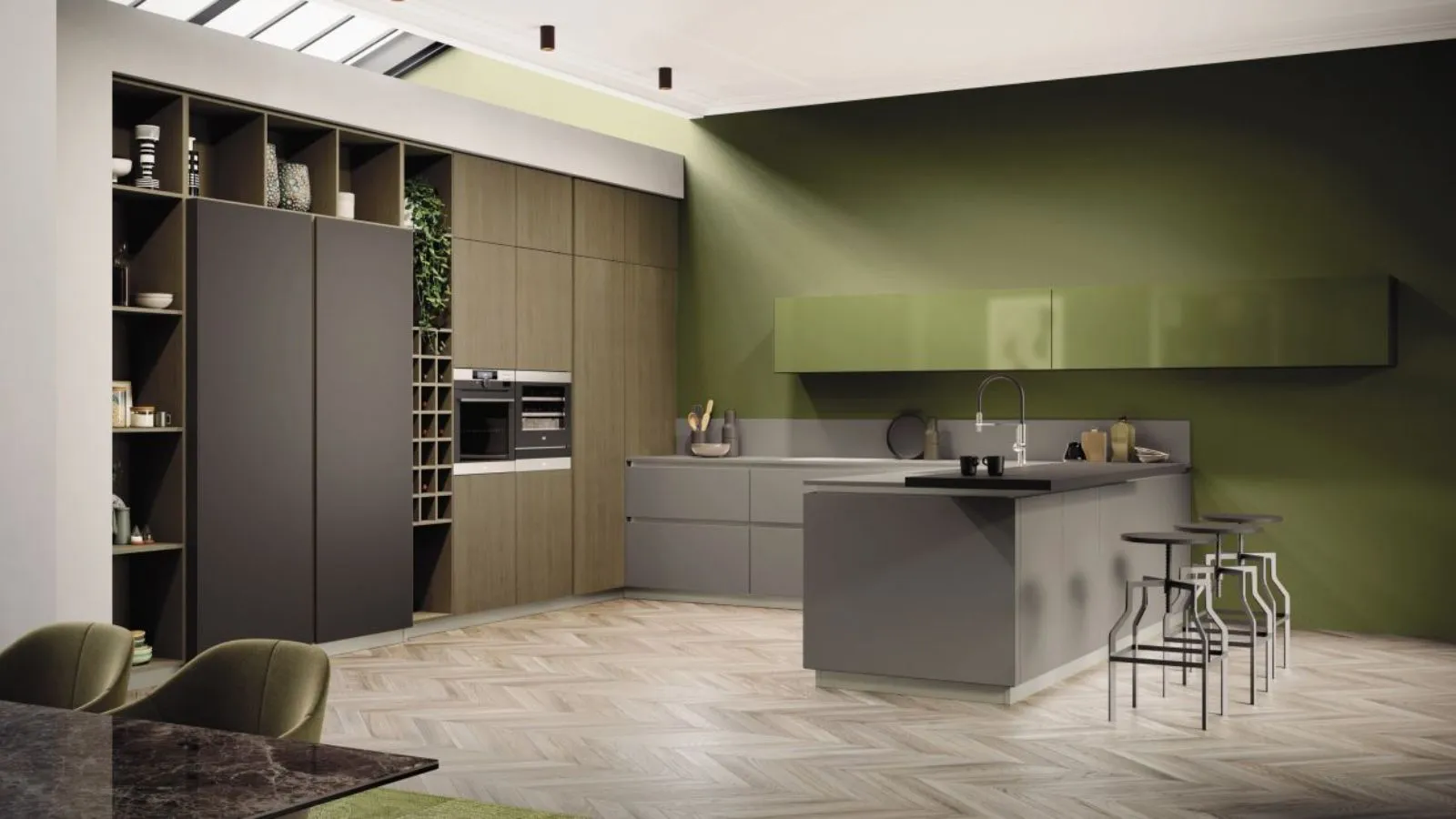 Ak_Project di Arrital gioca con il legno, il vetro e il Verde Ottanio per creare contrasti di grande impatto.