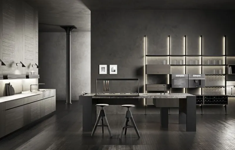In foto il progetto presentato da Cesar per Eurocucina 2018 e creato da Garcia Cumini. Lo compongono tre elementi distinti che però dialogano armoniosamente fra loro: Williamsburg, The 50’s e Intarsio. Il primo è l’isola centrale, una vera e propria area operativa che tuttavia funge all’occorrenza anche da tavolo per consumare i pasti; per questo motivo, lo spazio sottostante è libero da ingombri. The 50's è una reinterpretazione in chiave contemporanea delle librerie degli anni Cinquanta. Possono essere inseriti diversi moduli integrati fra loro: forni, porta bicchieri, porta bottiglie, vani chiusi e/o a giorno. La soluzione perfetta anche per collegare la zona dining e il living. Intarsio è invece un sistema basato su una strategica scomposizione delle geometrie delle ante che permette di valorizzare le venature del legno. Sono stati cioè realizzati effetti di apertura o continuità anche laddove non esistono le reali coincidenze delle ante; ne deriva un’illusione ottica tramite cui si percepiscono le reali interruzioni ma prevale il ritmo del disegno.