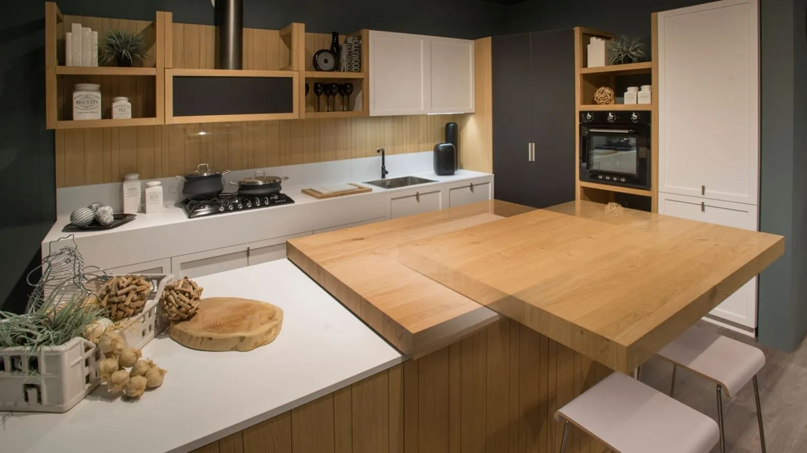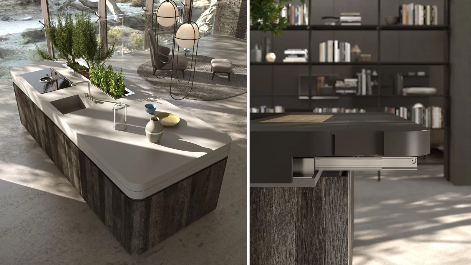 Oasi di Aran Cucine ci mostra un'isola operativa che estende il top da entrambi i lati con un sistema di scorrimento, per utilizzare le due parti come tavolo da pranzo.