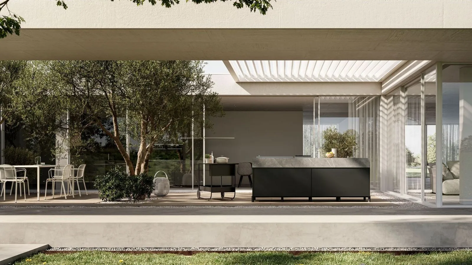 - È sempre consigliabile prevedere una copertura, come una tettoia o una pergola bioclimatica addossata, capace di offrire riparo e migliorare il comfort.