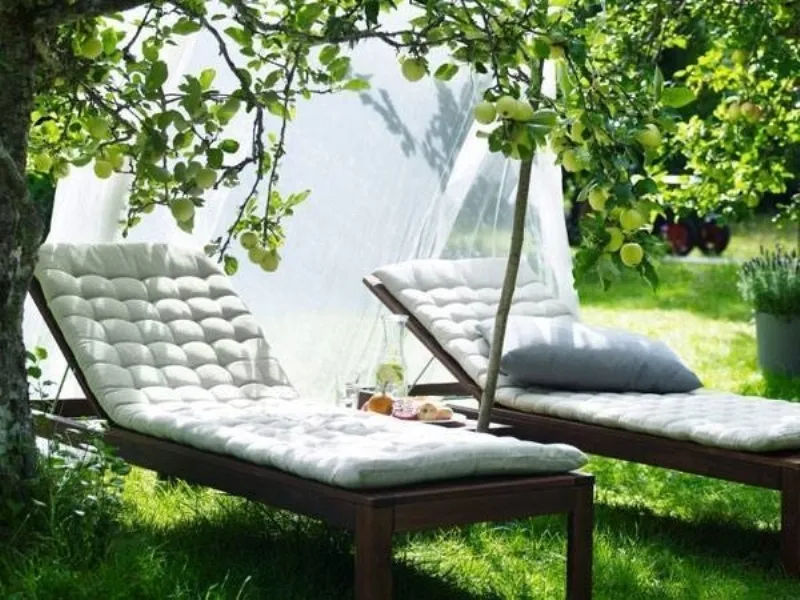 Per l'arredo del giardino, Ikea prevede sia le sedie da pranzo ce quelle da relax. Ogni tavolo ha diverse soluzioni di seduta abbinate, ma stesso nel catalogo Ikea lascia trasparire la possibilità di creare nuovi poco convenzionali abbinamenti, con sgabelli colorati, cuscini in fantasie differenti, per uno stile molto giovane e leggero, adatto al giardino. Le sedie abbinate a ciascun tavolo sono declinate in diverse varianti, in maniera tale da adattarsi a tutti i gusti e al maggior numero possibile di esigenze; con le forme, variano anche i prezzi. Sono disponibili, in una stessa serie, sedie pieghevoli, sedie con braccioli, panche, sgabelli di varie misure. La sedia TARNO è in vendita a dieci euro (trentaquattro euro la serie completa di due sedie e tavolino); per ANGSO sono state previste sedie con braccioli, sedie reclinabili e panche; molta scelta per la serie di tavoli (anch'essa variamente declinata) di APPLARO, con cinque alternative che variano dai venticinque euro per la sedia ai cinquantanove per la panchetta.
