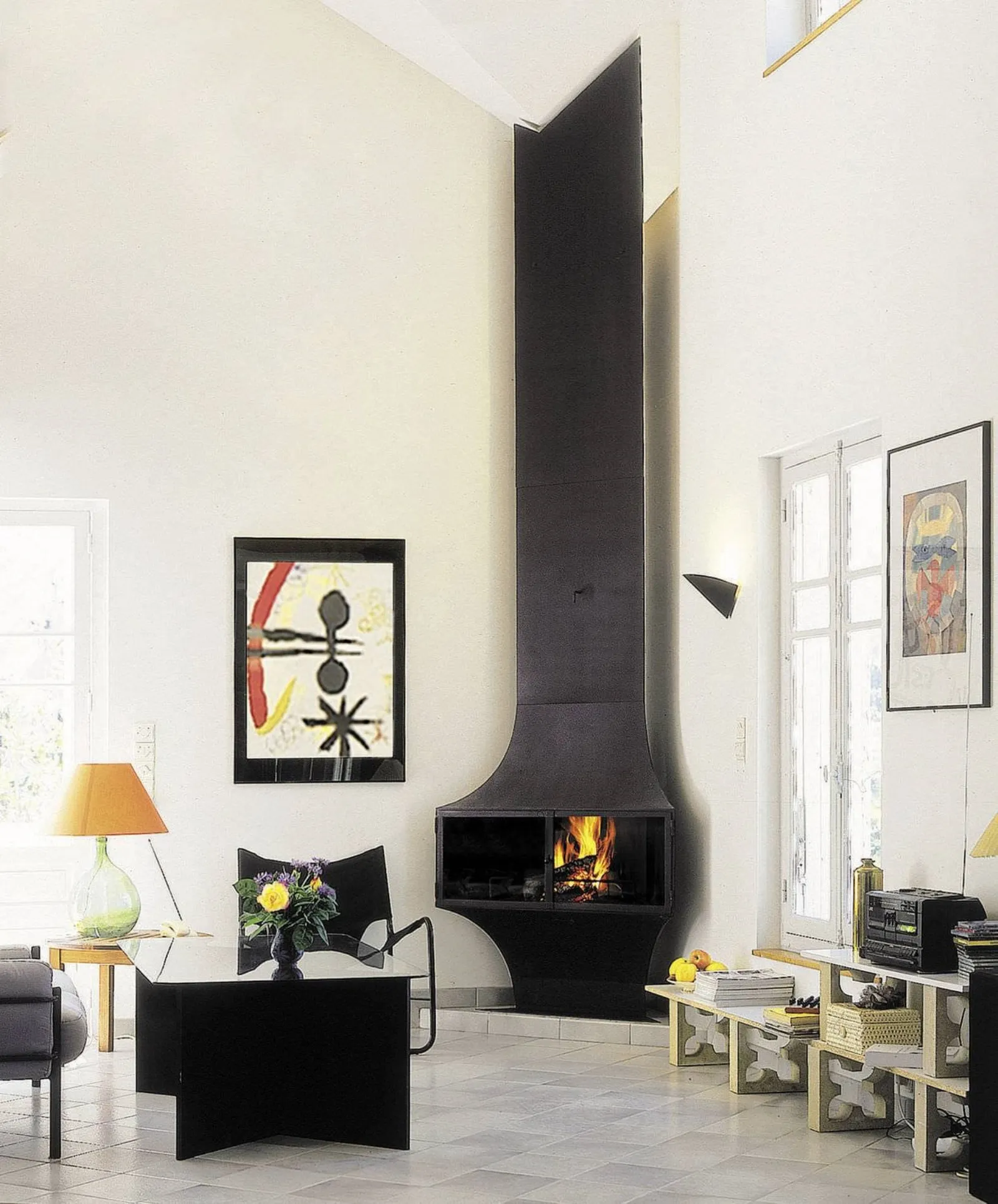 Il camino moderno ad angolo, a differenza di quelli a parete, sono ideali se lo spazio a disposizione è poco. Questi camini sono commercializzati solitamente in due varianti: una tipologia è più classica, ovvero si sviluppa su un raggio di 90° e si inserisce nell'angolo di una stanza, oppure esiste un tipo di camino detto "trifacciale", ovvero delle strutture libere su tre lati che si sviluppano all'interno della stanza distaccandosi dalla parete. Queste soluzioni permettono che l'arredamento venga disposto in maniera indipendente rispetto al caminetto, a differenza di come avviene per i modelli classici a parete. Con un camino ad angolo infatti si ha la possibilità di sfruttare maggiormente le pareti adiacenti, mentre i divani possono essere disposti a semicerchio attorno ad esso.