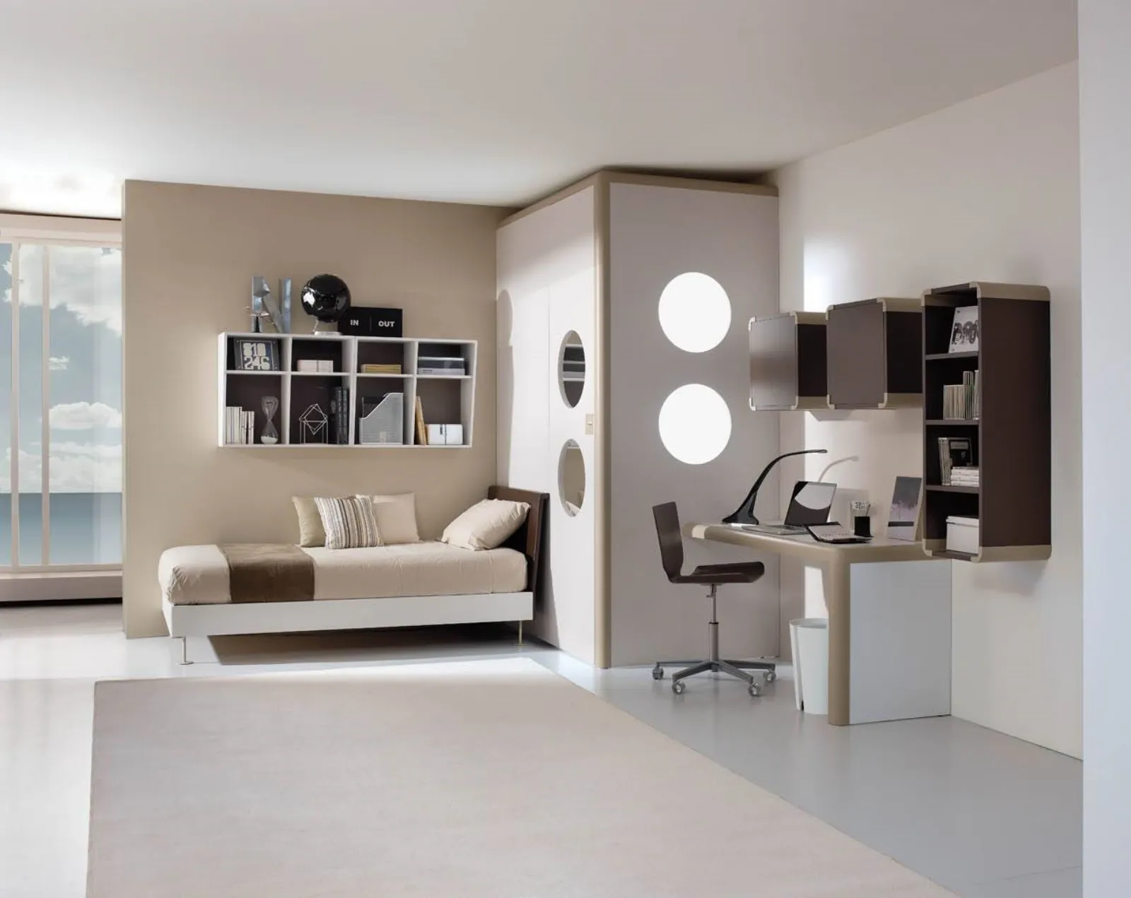 La Composizione Tiramolla 189 di Tumidei camerette, è composta da un letto a soppalco con sistema armadio ad ante battenti. Dotato di angolo scrivania e diversi ripiani contenitori, è disponibile in differenti colori. Il prezzo parte da € 7.500,00. La soluzione proposta da Tumidei camerette per Tiramolla Composizione 130, propone un letto a soppalco e un secondo a terra. L'armadio angolare ad ante battenti incornicia lo scrittorio sottostante. Acquistabile partendo da € 9.000,00. Il sistema di mensole componibili e i mobili contenitori da parete caratterizzano l'arredo della Composizione Tiramolla 121. Il modello di base offre uno scrittoio, un letto a una piazza e mezza, un comodino con tre cassetti, da € 4.000,00. Sistema armadio angolare ad ante battenti in nobilitato per la soluzione Tiramolla 128. La cameretta comprende un letto, un comodino con due cassetti e delle mensole. La superficie dell'armadio è personalizzabile grazie alla stampa digitale e le rifiniture sono realizzate in laccato. In commercio dal prezzo di € 7.000,00. Lavorazione di qualità e design contemporaneo con Tumidei camerette per ragazzi, tante soluzioni originali e funzionali. Tumidei modello Tiramolla 128