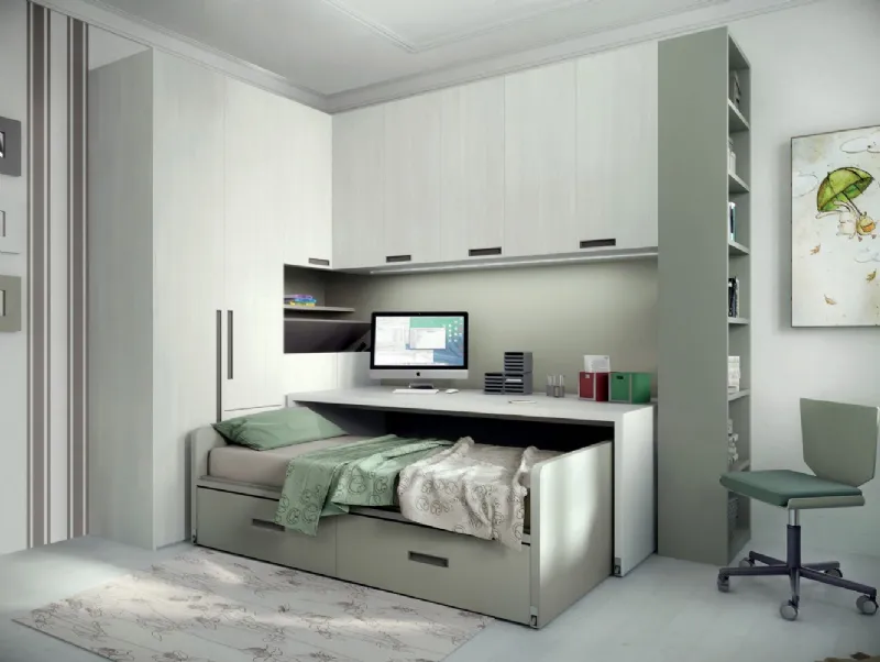 Se la cameretta è piccola si può scegliere una composizione con scrivania salvaspazio sulla stessa parete del letto. In questo caso, sia la scrivania che il letto sono elementi mobili che si adattano alle necessità del momento, assicurando durante il giorno il giusto spazio per studiare e massima funzionalità per la notte.