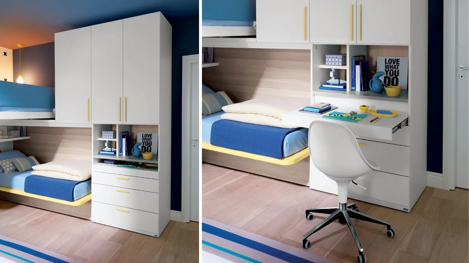 Scrivania a scomparsa salvaspazio tra due letti sovrapposti